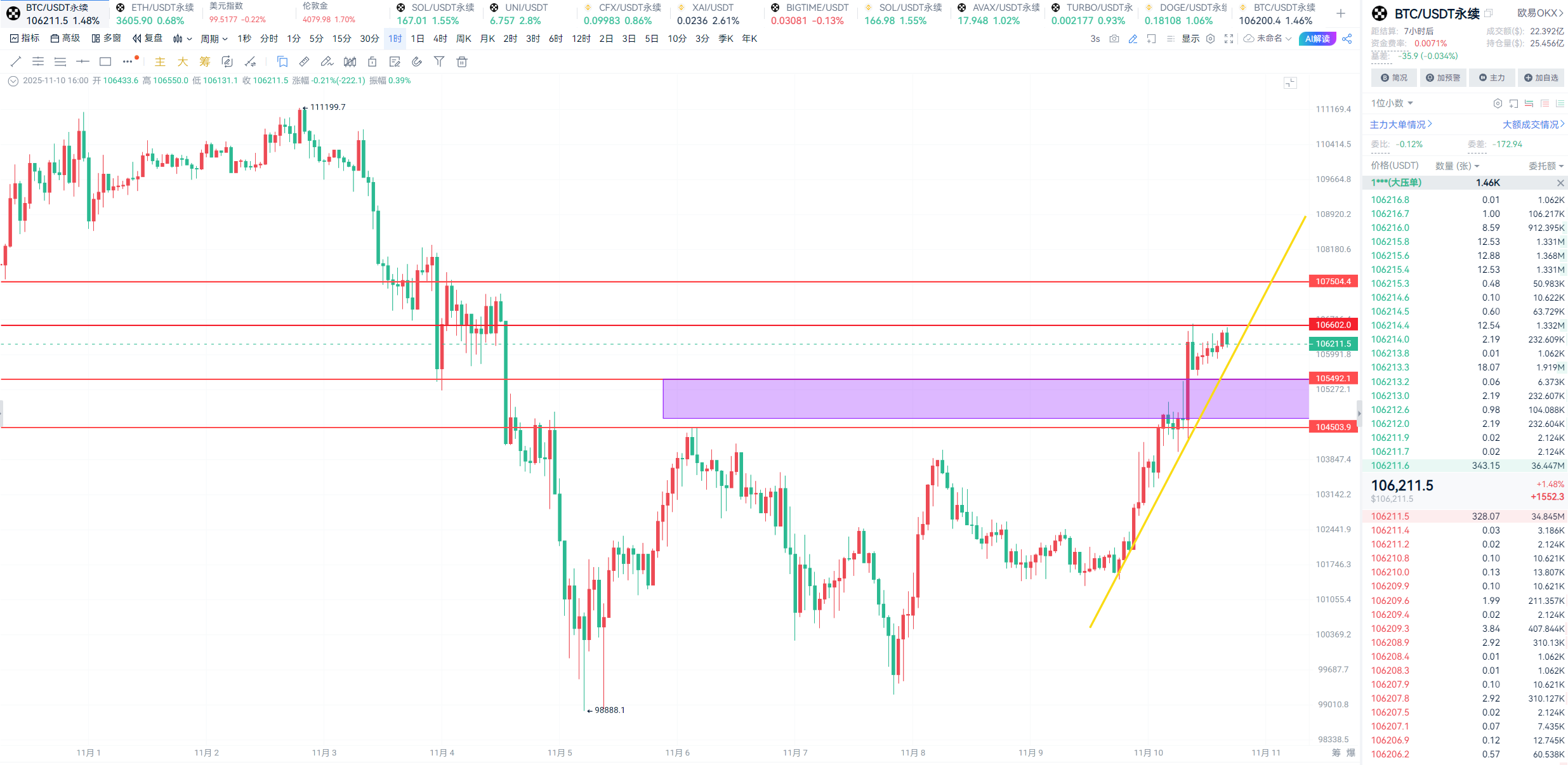 The 4-hour level is crucial: 105-105.5K is the lifeline for rebounds; a pullback now is normal, and as long as it doesn't break down, it's a healthy fluctuation. The RSI is already at 66, not far from overheating; if it rushes too much, it will definitely pull back, and that pullback is actually an opportunity—104.5-105K is the entry point, don't wait to chase after it rises. A normal pullback after hitting 106.6K can stabilize and explore above 107K, with a key focus on whether it can hold above 107.5K.