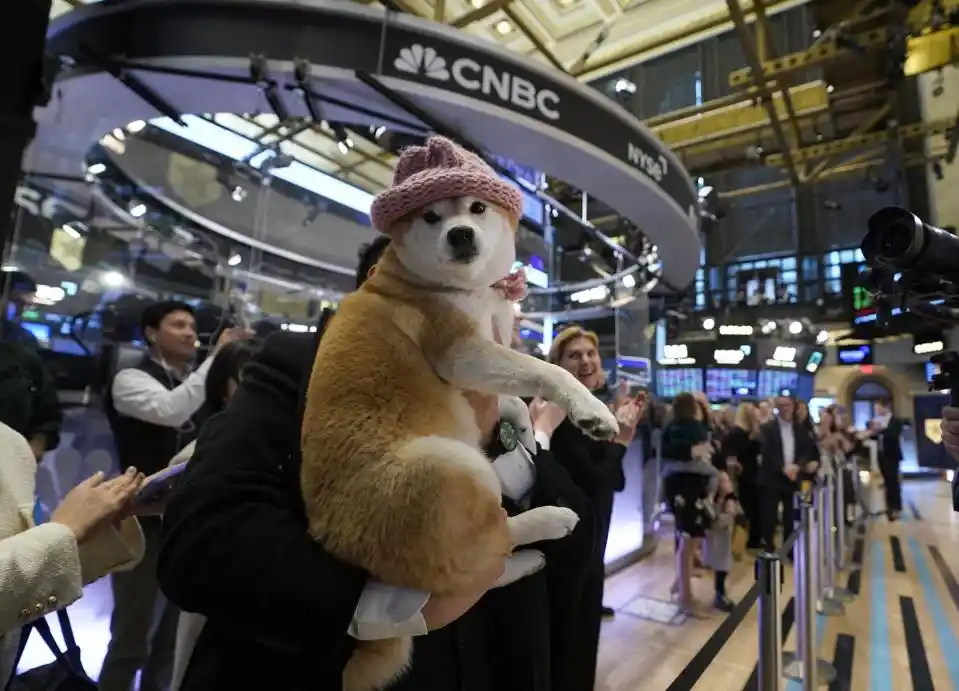 2025 年 1 月 23 日,著名「dogwifhat」迷因中的狗狗 Achi 出现在纽约证券交易所的开市钟仪式上。