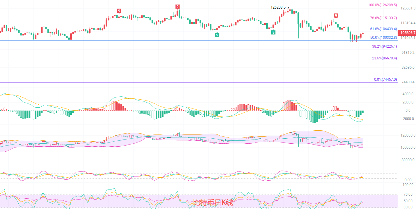 日K线发稿前最高106666,最低104200,EMA15趋势快线已经抵达了106150一线,上方阻力位关注0.618一线106450,MACD底部缩量减少,DIF和DEA出现收缩,行情只要守住了关键阻力点那么空势就会再度开启,布林带开口扩散,K线来到了布林带中规107900的下方,整体趋势上短线建议高位南下为主
