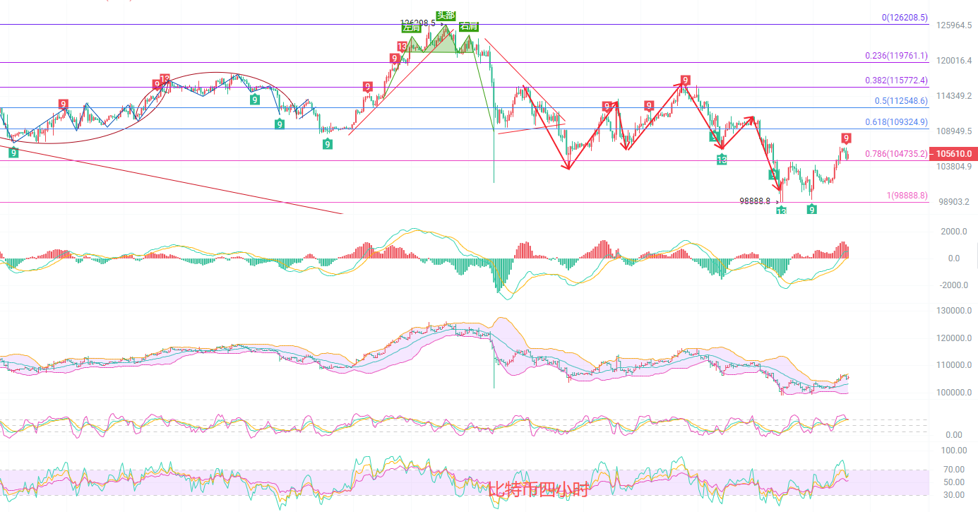 四小时K线神器九转已经出现顶部压力位参考EMA120一线107165,MACD放量减少吗DIF和DEA刚破0轴线走上高位就开始收缩,说明上方有很强阻力,布林带上轨关注106800,那么思路上不排除有进一步上探的动能存在,可以以下方支撑强弱来决定是南下还是北上