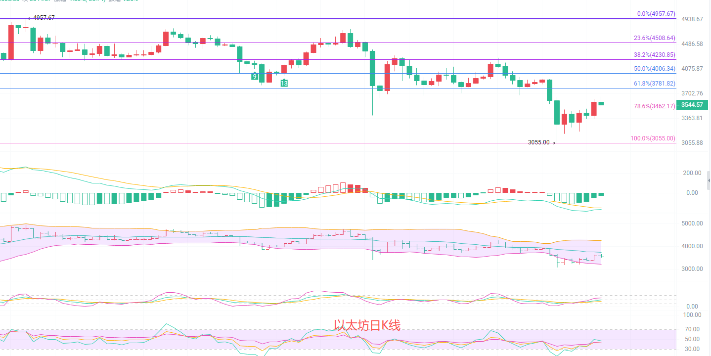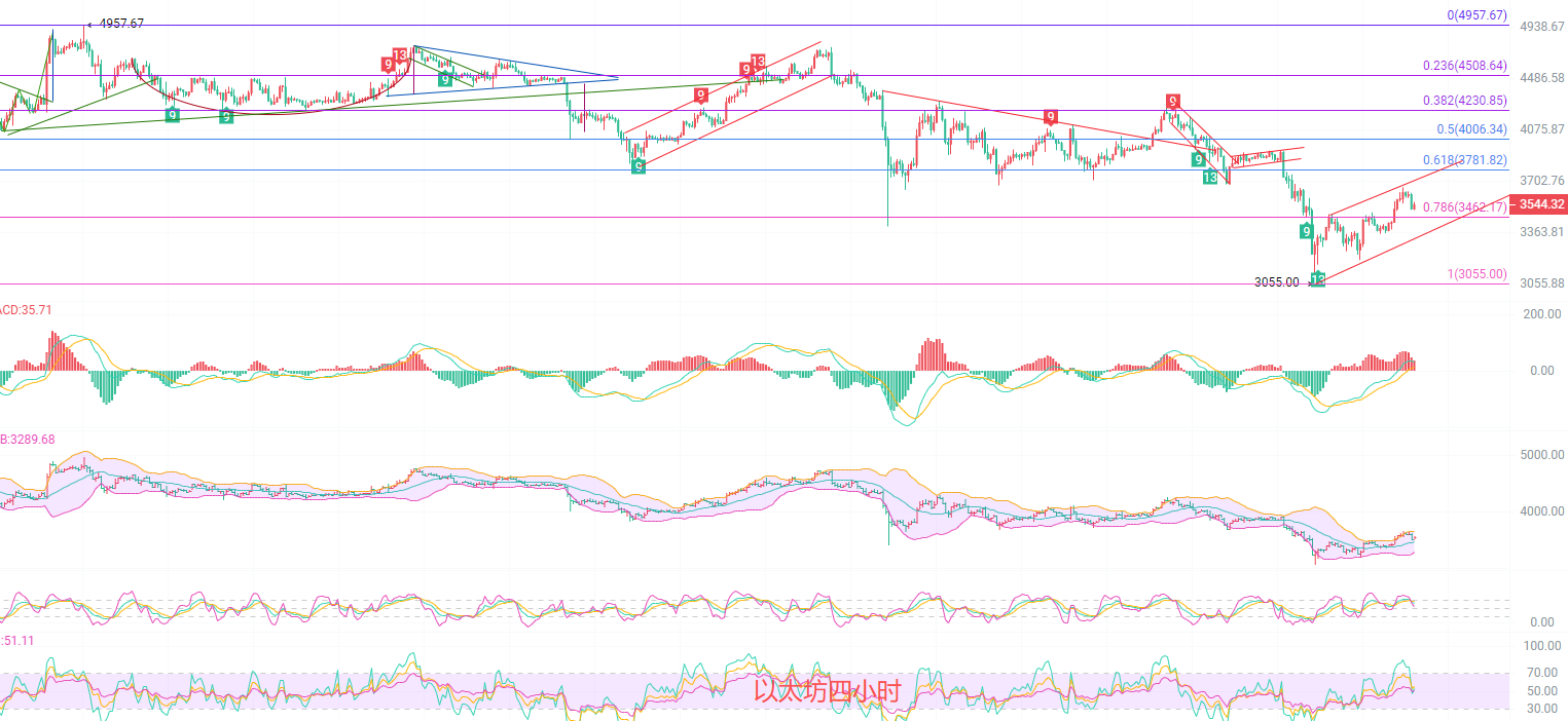 四小时K线上升三角破位3450以后拉伸冲击EMA90一线3630,下一步的高点关注3700到3780的强弱,MACD放量下行,DIF和DEA走上0轴线,布林带上轨下压到了3655,整体趋势上偏震荡,短期内大的方向不会来,喜欢做波段的可以尝试去做一下