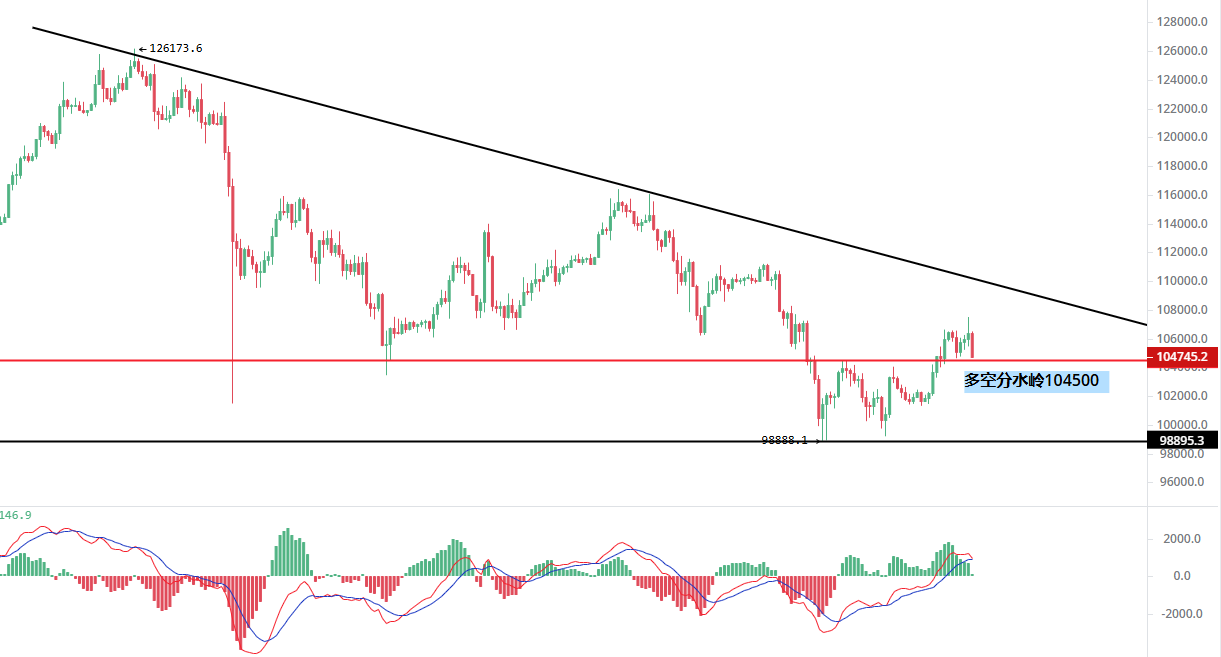 关键支撑位:104,500 — 104,000 美元区间,为多头最后防守带;若跌破该区,将可能进一步下探至 101,500 美元 附近。
