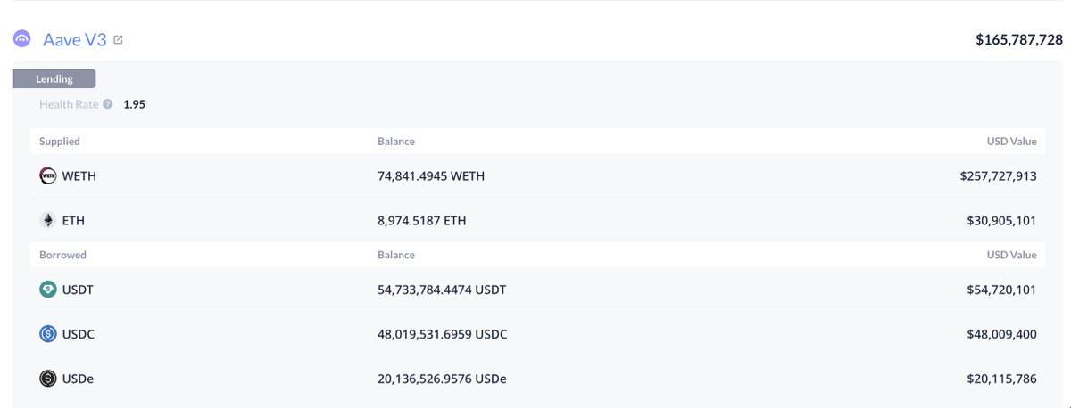 He currently has 83,816 $ETH($288.6M) deposited on Aave and has borrowed $122.89M in stablecoins.