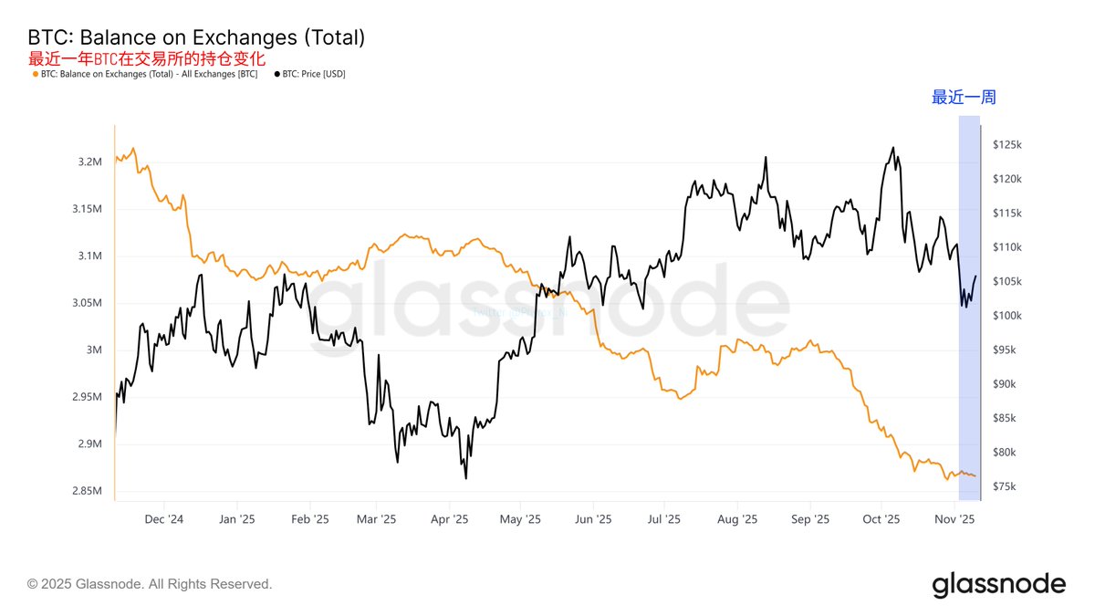 第二,现货需求依然强于抛压,尤其是机构与大额地址的吸筹趋势更明显。过去两周 BTC 有几次快速下探,但交易所的存量反而下降,这说明每一次波动都投资者在把低位的筹码买走,价格的弱势更多来自流动性偏弱,而不是抛售的增加。