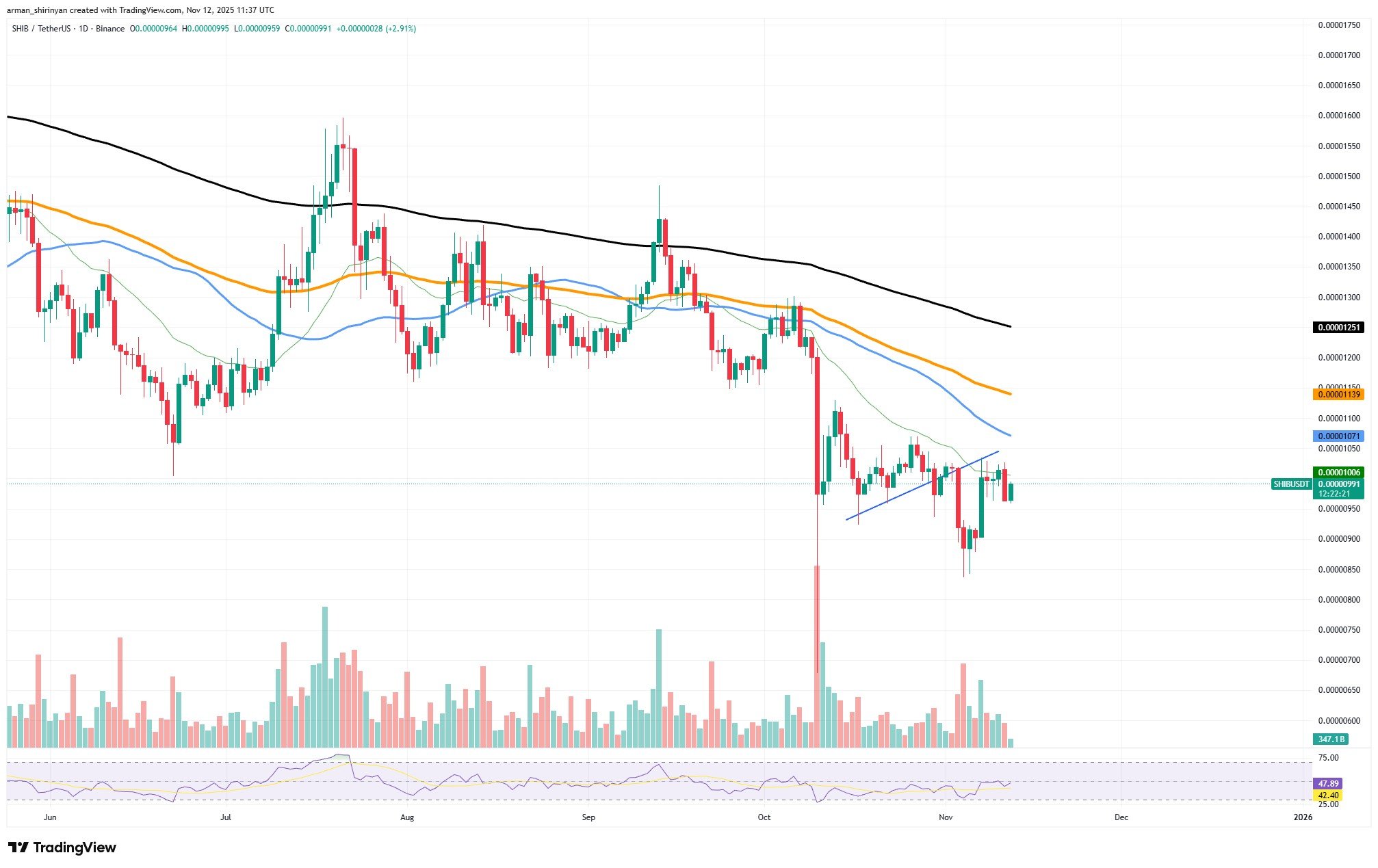 这种流出激增在历史上通常预示着市场的恢复,因为它们显示出卖方压力的减少。从技术上讲,SHIB在0.00099美元附近保持稳定,过去一天上涨约3%。该代币在日线图上从约0.0000085美元的局部低点反弹,但整体情况仍不明朗。