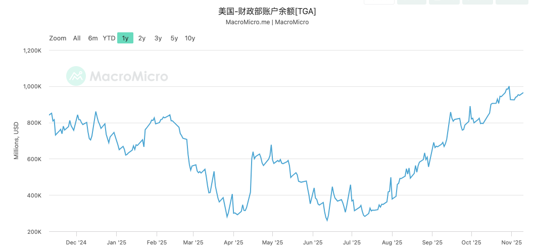 Secondly, the government shutdown also drained market liquidity. The U.S. Treasury General Account (TGA) is responsible for all government expenditures, not only paying U.S. civil servant salaries but also injecting liquidity into the financial market. The government shutdown caused the TGA to only take in funds without any outflows. According to MacroMicro data, during the government shutdown, the TGA accumulated over $1.459 trillion, with a current balance of $965.3 billion.