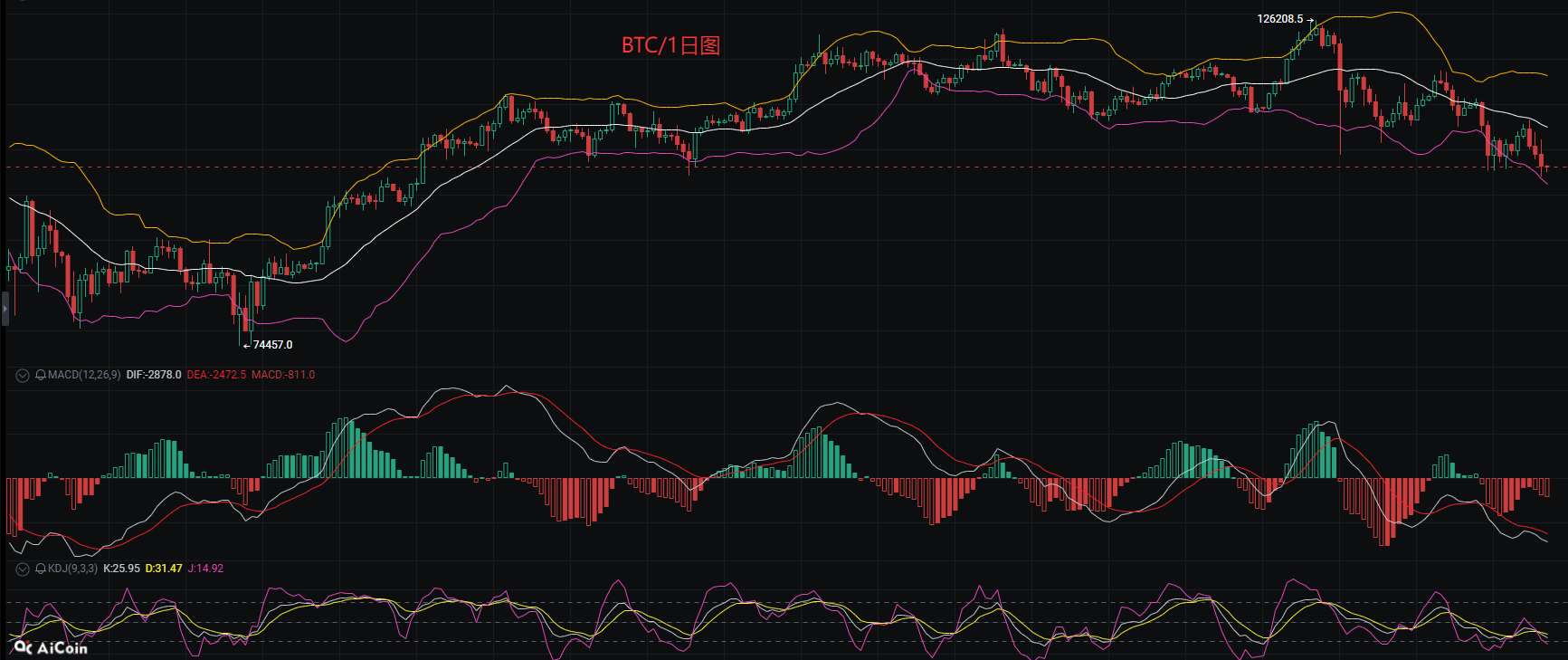 比特币昨日是不断向下破位,日内跌幅达到5000多点,目前低位触及98000一线附近才走出反弹,日前价格在9950附近区域运行。早间是走出一波反弹,目前已经临近短期压制区域,且小时图上行已经开始受阻,价格在10万附近位置已经出现承压,布林带呈逐渐收口,上方阻力开始缓慢下移,后续压制关注102000一线,日内不能突破此区域,行情还有回撤的可能。比特币这波回调,短期走势走势再度进入弱势盘整,但是整体跌势未散,望各位币友提前做好准备。上方关注100500一线,其次102000位置,下方支撑关注98000一线,