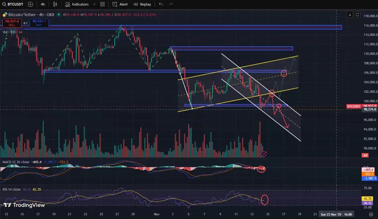 日线级别大阴线放量,跌破上升通道下轨, 在 98,000 前低位置暂时获得支撑,反弹压力在101,500附近(重新测试通道下轨),若压制有效,形成下跌楔形 ,下跌目标约 95,000 ;短线级别关注4小时,短线机会伺机而动