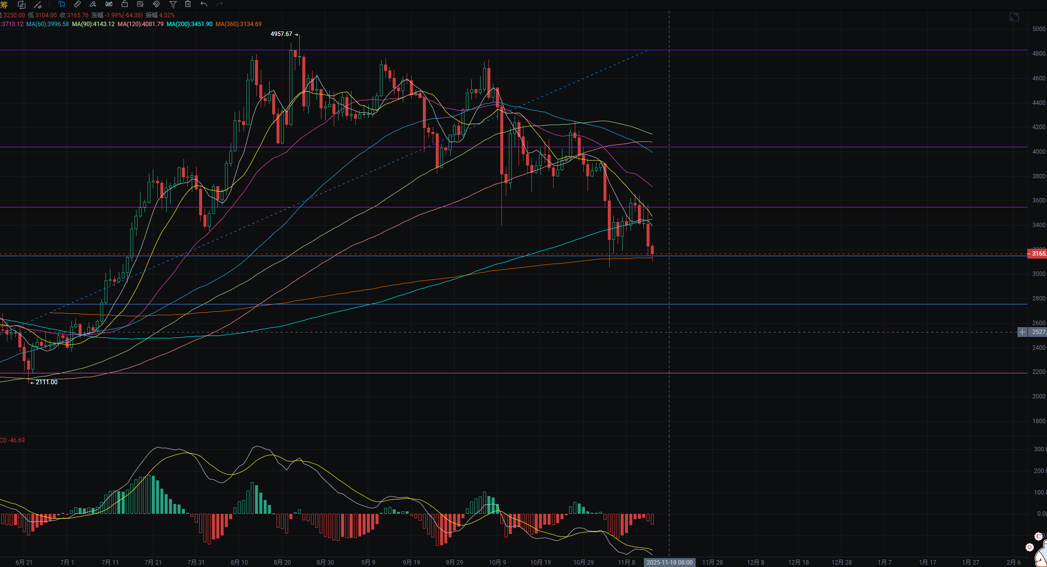 今天的大饼价格直接跌破了6月25日以来的最低价,创造了当前2025年下半年的最低价格,而下跌的主要原因包括了投资者对于美联储12月降息的悲观,美国政府停摆导致的流动性紧缺,首先被抛售的科技股,在闭盘前英伟达一度下跌了超过 4.5% ,虽然没有直接的利空信息,但投资者还是担心通胀和劳动力市场的下
