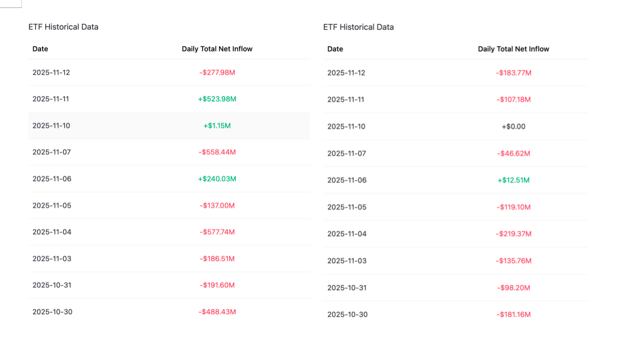 最直观的数据在于 ETF 资金流向,比特币及以太坊资金外流严重。据 ichaingo 数据,上周美国比特币现货 ETF 累计净流出约 12.2 亿美元,已连续两周净流出,以太坊现货 ETF 净流出也高达 5.08 亿美元。昨日比特币现货 ETF 净流出更是高达 8.7 亿美元,创下了历史第二高的纪录。从下图中,我们不难发现,自本月以来,比特币及以太坊 ETF 呈现出极为明显的「出多进少」局面。