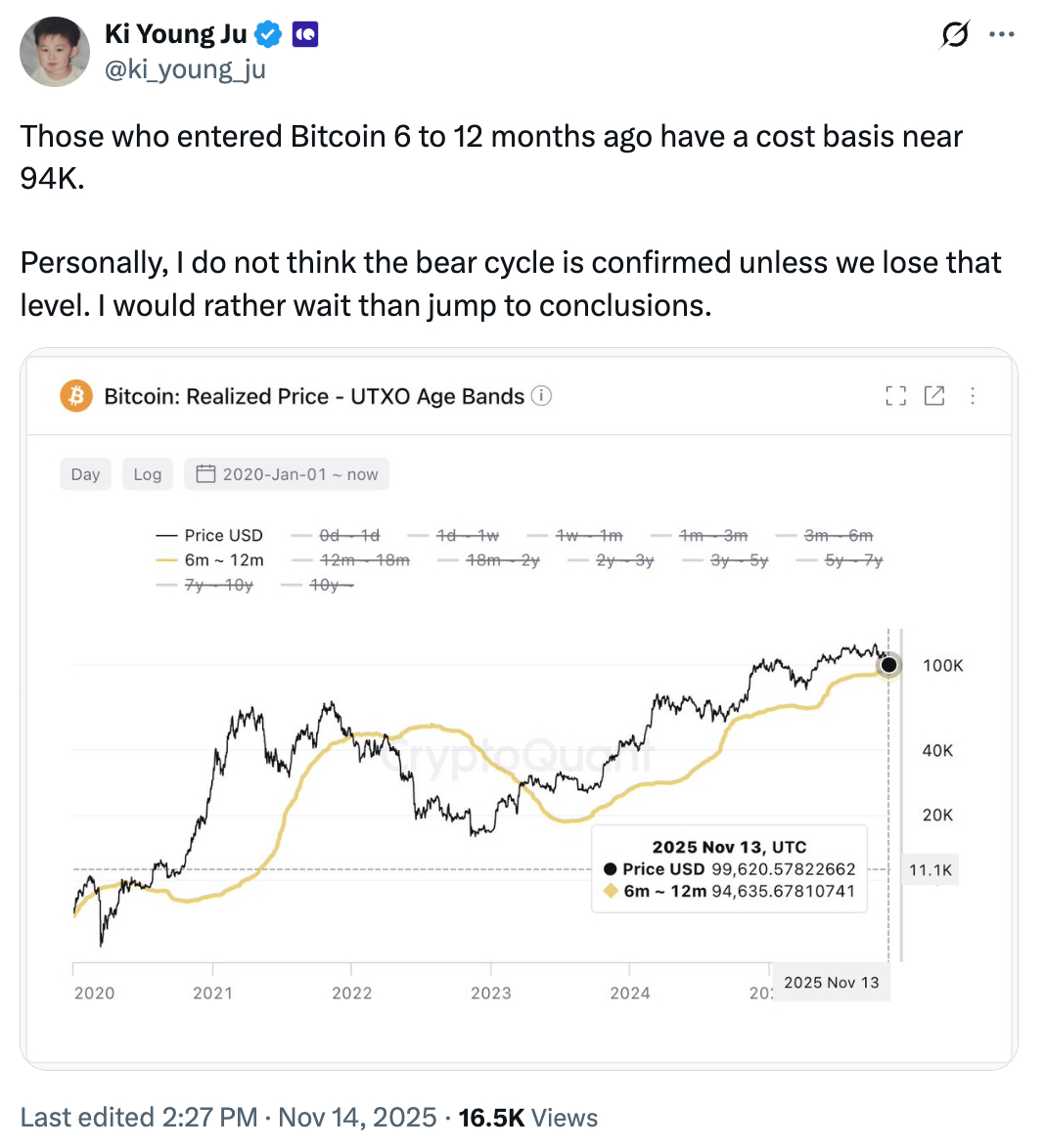 CryptoQuant 创始人兼 CEO Ki Young Ju 则发推称,过去 6 至 12 个月入场的比特币投资者,平均成本大致在 94000 美元附近。他指出,只有当价格跌破这一成本区间时,熊市周期才可能得到确认,目前切不可过早下结论。