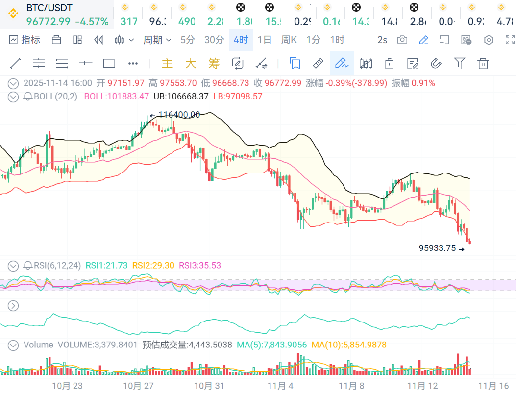 BTC:4小时级别看,价格跌破布林线下轨,价格走势弱势。