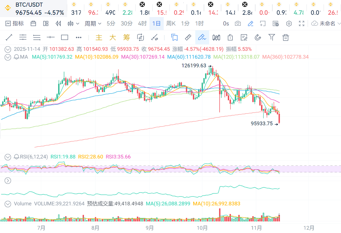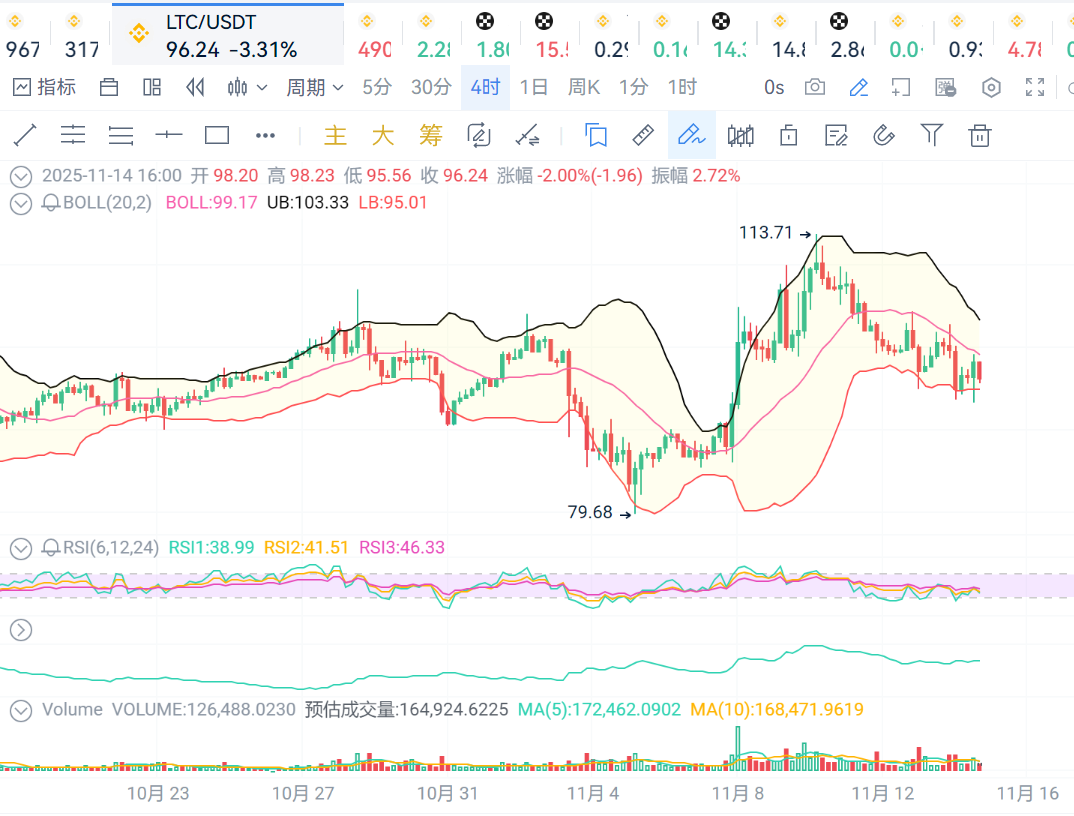 LTC:价格继续保持在布林线中轨之下,价格走势弱势,支撑位95,压力位98.