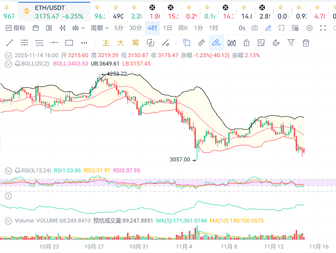 ETH:4小时级别看,价格跌破布林线下轨,价格走势弱势,支撑位3160,压力位3190.