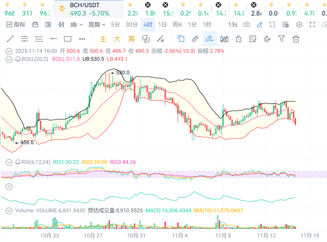 BCH:价格跌破布林线下轨,价格走势弱势,支撑位480,压力位500.