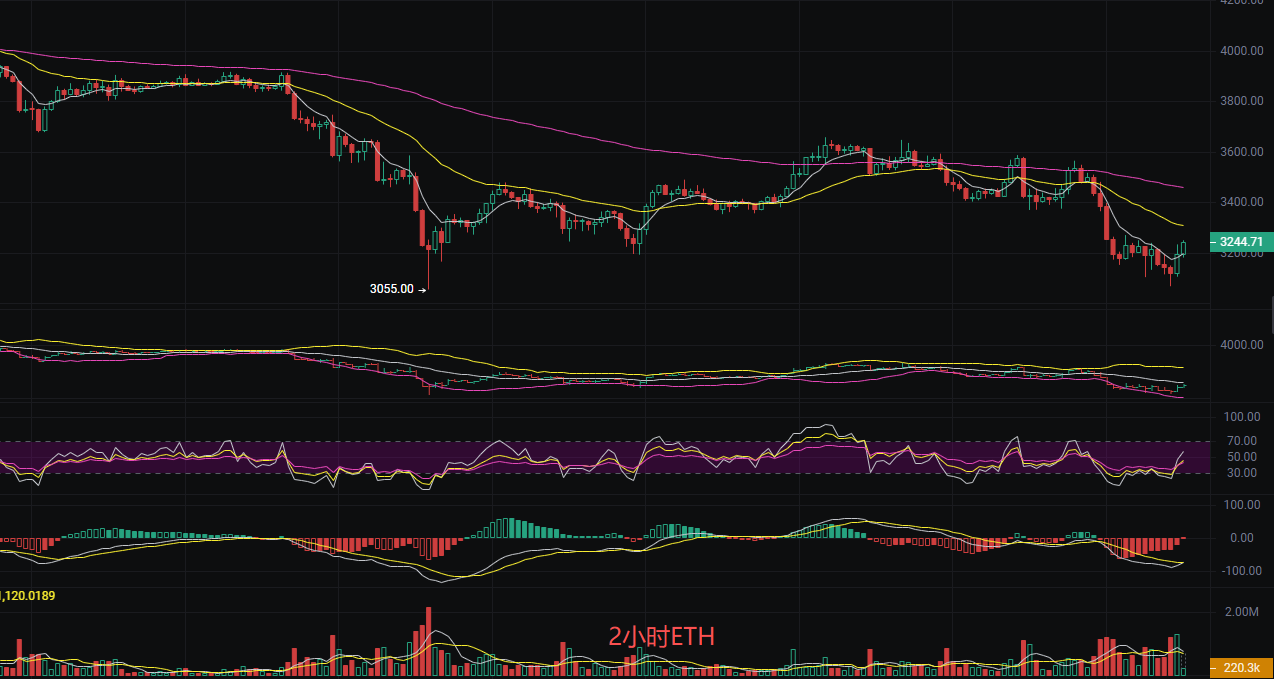 Before publication, the current price of Ethereum is 3212. Li Ying observes that the current market has Ethereum between the support at 3055 and the resistance at 3968. The technical analysis shows that although the moving average system is in a bearish arrangement and the short-term trend is weak, the candlestick pattern has formed a bullish engulfing signal, indicating potential for a reversal. The continuous bearish candlesticks on the daily chart suggest some selling pressure. The MACD on the 2-hour chart shows a bearish dominance, and Li Ying believes there may be a demand for a rebound. The EMA is overall bearish, with EMA7 providing short-term support for the price. Li Ying's consistent approach is to follow the trend; the larger trend is bearish, and with a short-term pullback, the best strategy is to wait for a short-term pullback to encounter resistance before looking for a position to short, and it is not recommended to chase long positions at this level.