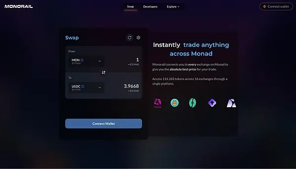 Monorail 是 Monad 上的一个现货聚合器,它将订单路由到链上,为用户争取到尽可能好的价格。他们目前在路由中连接了 16 个交易所。