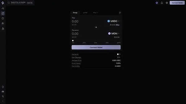 Monday Trade 是一个基于 Monad 的混合现货去中心化交易所(DEX),它在一个平台上结合了自动做市商(AMM)流动性和链上订单簿。这种混合模式,加上其高燃气效率,使 Monday 成为执行顺畅交易而不会产生高滑点的理想平台。
