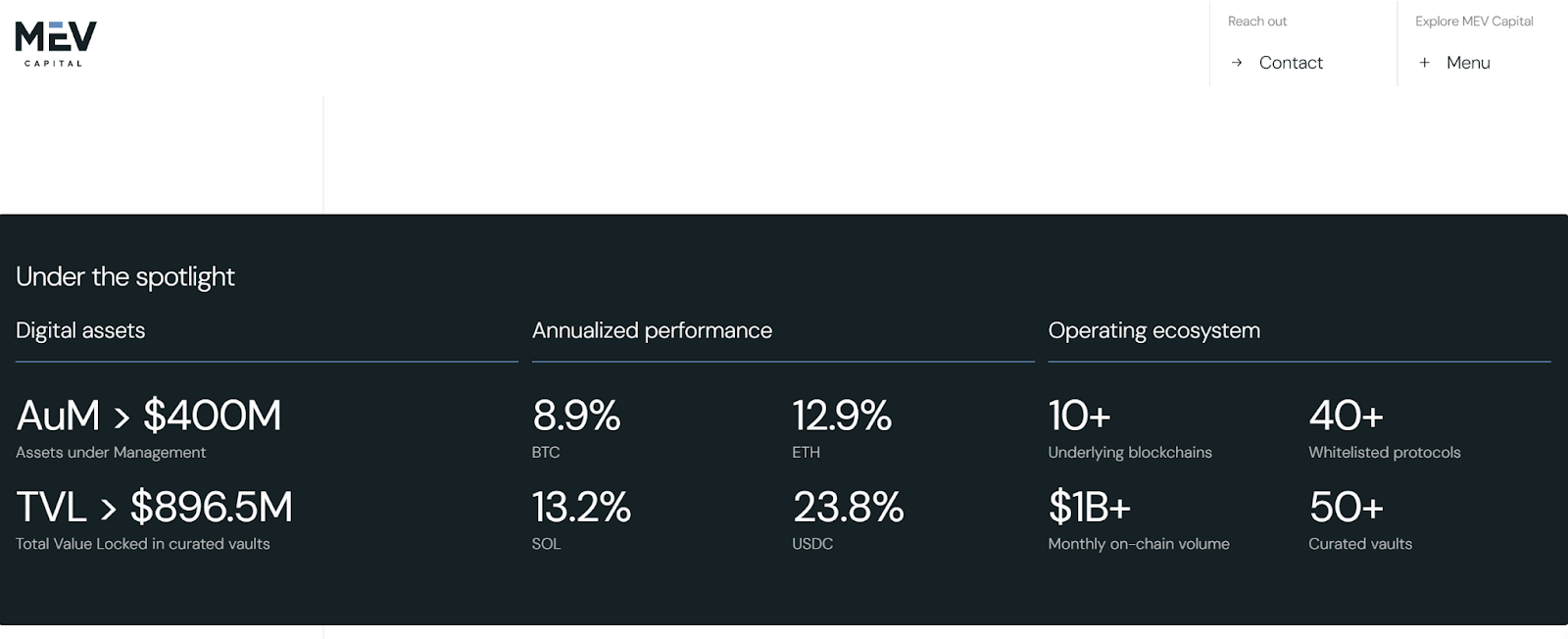 一家以 DeFi 量化对冲策略见长的 Curator,管理资产峰值近 $10 亿,目前已经降至4亿美元。团队由传统对冲基金和链上套利专家组成,擅长利用 MEV等手段增强收益。MEV Capital擅长采用场外期权对冲策略叠加循环借贷来提高资本利用率。在极端行情下,这种高杠杆设计加速了爆雷。