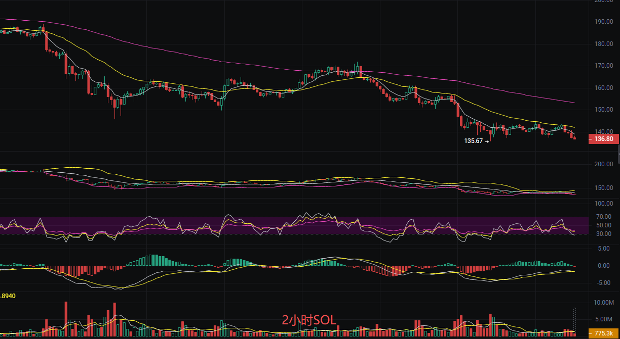 索拉拉目前价格为138,丽盈判断目前索拉纳SOL明显的下跌趋势,技术面显示空头动能增强,MA/EMA指标形成死亡交叉,价格持续低于短期和长期均线,表明趋势性下行压力较强。然而丽盈发现价格已接近强支撑位135.7,该价位为前期低点,具有较强的技术意义,