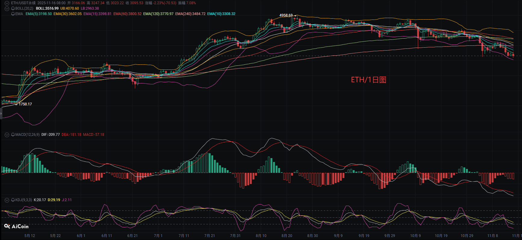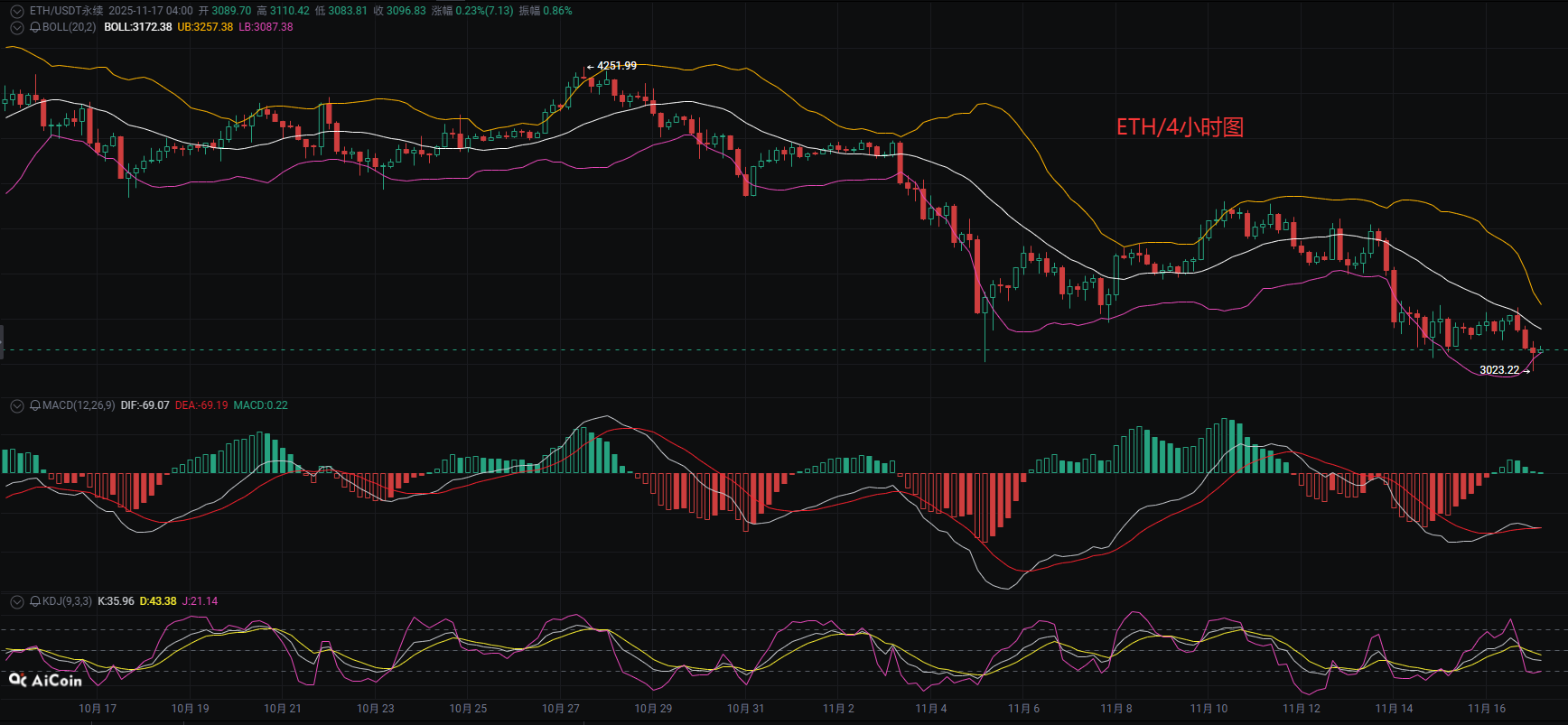 After a rebound during the day, Ethereum has once again declined, currently trading around the 3100 level. The short-term market is breaking down again, refreshing previous lows. In the hourly chart, the price fell from 3249 to 3026, then rebounded to 3107.55, forming a short-term bottoming structure. On the daily chart, although a long lower shadow was formed on November 14 (range 3070—3256.71), indicating some support at lower levels, the rebound momentum could not be sustained for the next two trading days, showing an overall weak consolidation pattern.