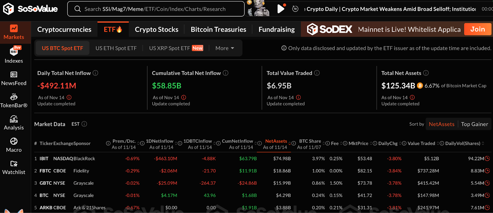 据统计,在11月10日-11月14日期间,美国比特币现货ETF净流出:11.11亿美元;截止到11月14日,GBTC(灰度)共计流出:246.38亿美元,目前持有160.91亿美元,IBIT(贝莱德)目前持有751.62 亿美元。美国比特币现货ETF总市值为:1267.87亿美元。