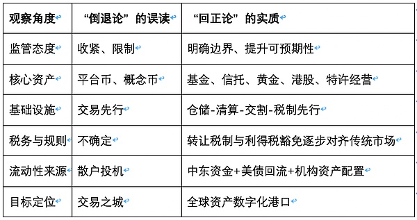 「倒退论」盯着的是泡沫期的表面繁荣;「回正论」看到的是监管、税制、市场基础设施在重构。我们用一个对照表,来把两种叙事摆到台面上: