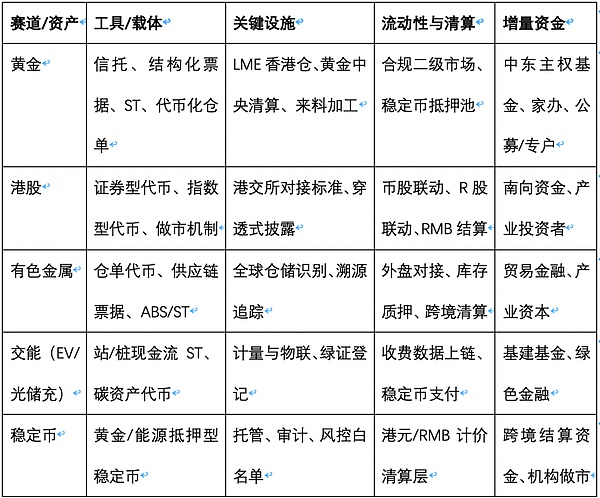 资产与工具更广:从黄金、有色金属、农产品,到信托、指数、港股的代币化,说明香港把 RWA 代币化当作工具箱而非投机场。