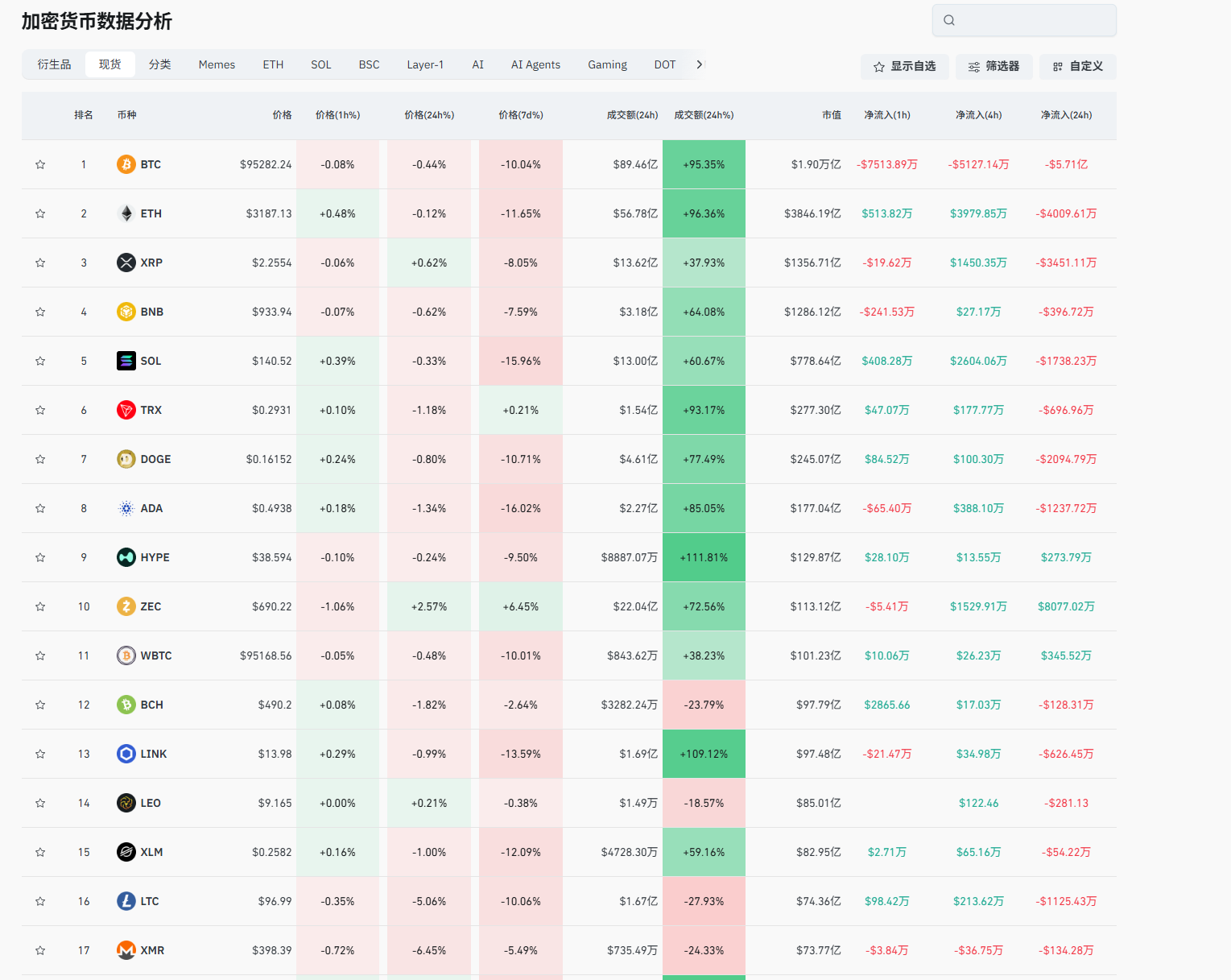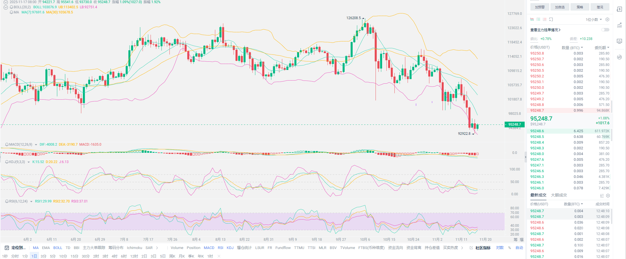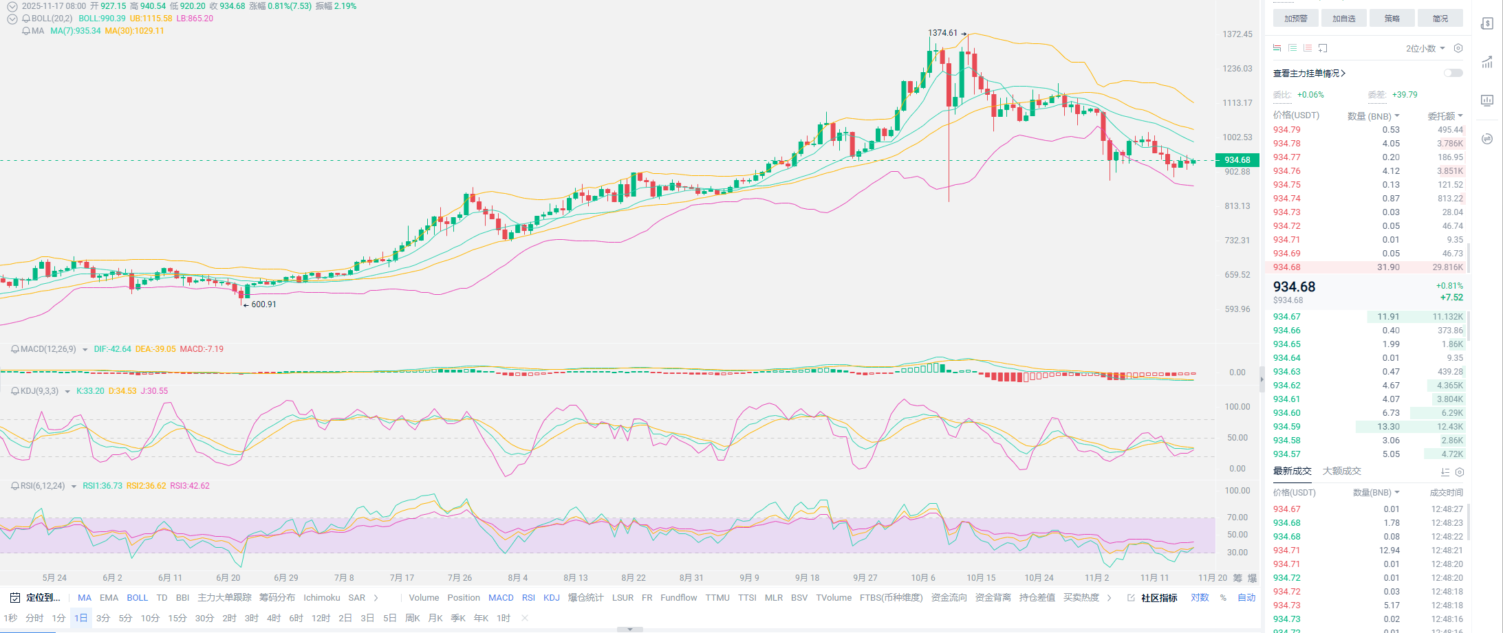 今日的文章,将下周的走势进行一个预测,自明日与后天,近两天的时间老崔也需要出差一趟。所以大家如果有问题的话,尽量今日就问,后期的回复恐怕会有一定的延迟性。14日创下比特币新低939550,行情的走势也是缓步上行,有修复的趋势。时至今日已经来到十一月的中旬, 在此是有机会止步空头,对多头的方向进行冲击。尤其是恐惧的贪婪指数已经来到了15,对比今年的最低点比特币7W之时更低。大家也要形成对比的习惯,比特币在上半年下行之时,期间出现过川普币,SOL等一众较为吸睛的币种,暂时是能够撑住币圈的脸面。也包括本次,下行期间同样也有BNB的支撑,但BNB的特殊性,并不独属于币圈的脸面,可以说本次的下行几乎是普跌。