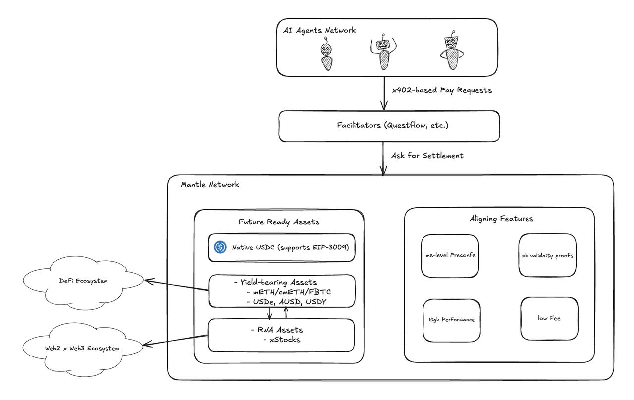 Mantle 的发展战略深度融合了银行业级基础设施、AI 驱动经济及现实世界资产(RWA)三大趋势,与 x402 协议面向全场景支付的发展路径高度契合。随着 x402 逐步扩展至更多区块链网络,Mantle 凭借其 Preconfs、多样化的链上优质资产(如 mETH、cmETH、fbTC、USDe等)及不断增长的流动性,将成为 x402 实现“任意资产支持”愿景的关键载体。