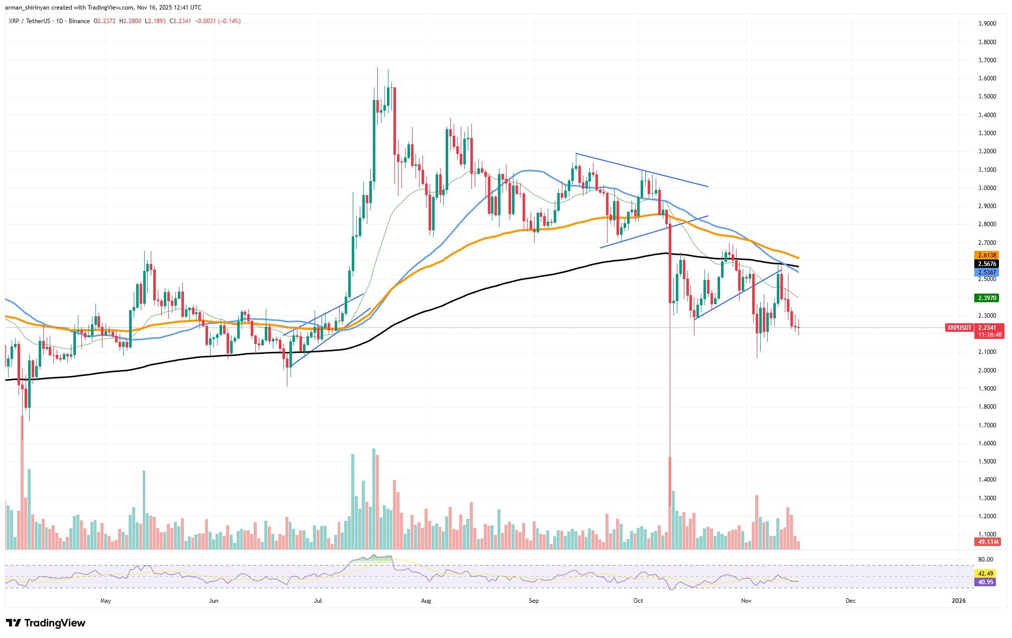 如果XRP希望重新获得其看涨动能,它必须突破该区域。然而,值得注意的是,尽管存在强大的阻力,价格仍然保持得很好——尤其是考虑到整个市场的波动性。买家显然在$2.30-$2.35区间进行干预,因为XRP一直在坚决防守。RSI约为41,表明动能较弱,但重要的是,它既没有超卖也没有崩溃。看起来这个阶段正在稳定,而不是退出。