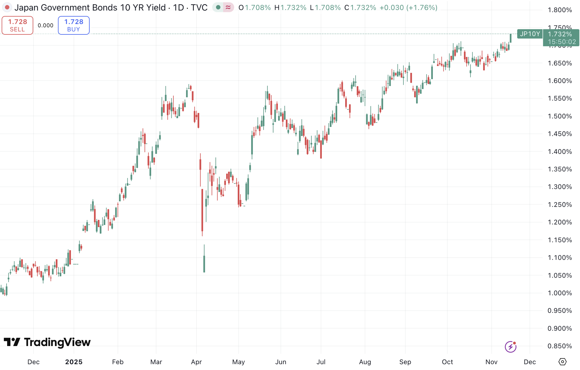 上周市场极度恐慌,美国政府停摆结束的阶段性利好迅速被12月份美联储降息概率下降这一事件带来的利空取代;同时日本长债收益率持续走高,目前10年期国债收益率升至1.73%,创下17年新高。