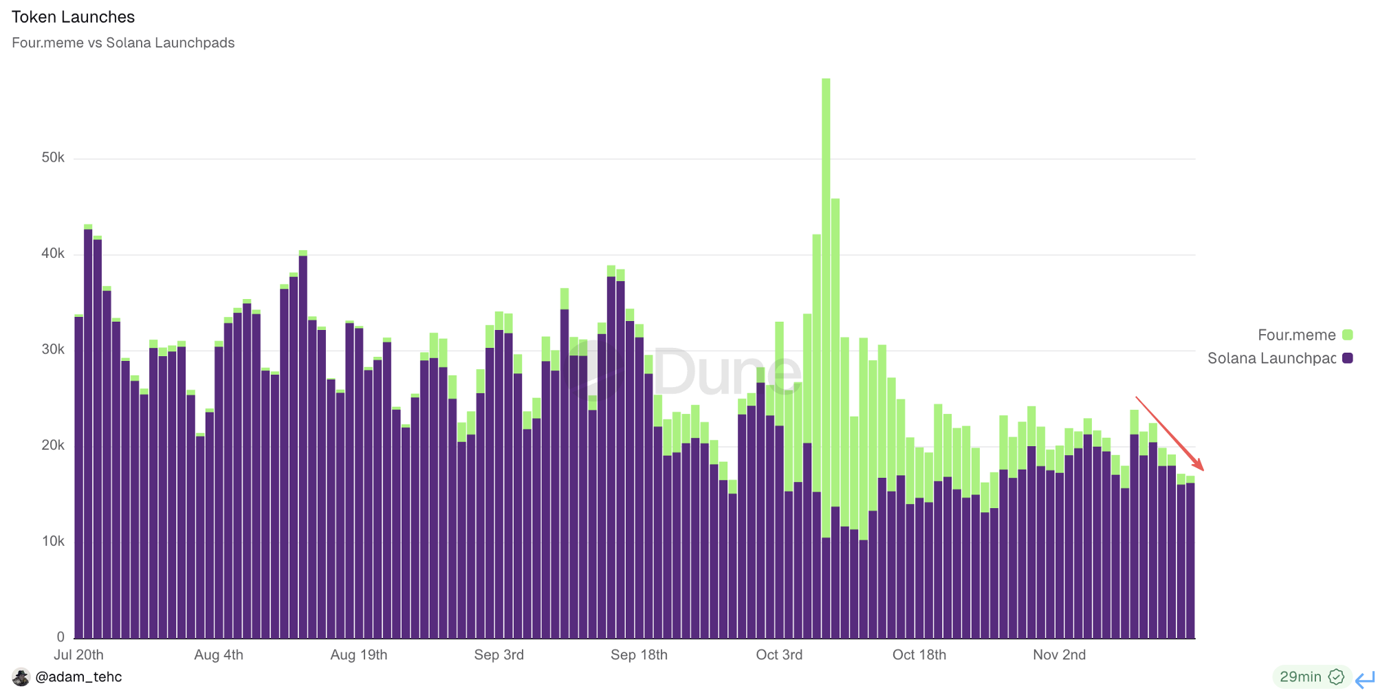 3、上周交易所内山寨合约持仓量和交易量双双下滑,反映出10月11日暴跌之后流动性的持续匮乏;Solana和Bsc链上代币铸造数量也在持续下滑,市场缺乏热点。