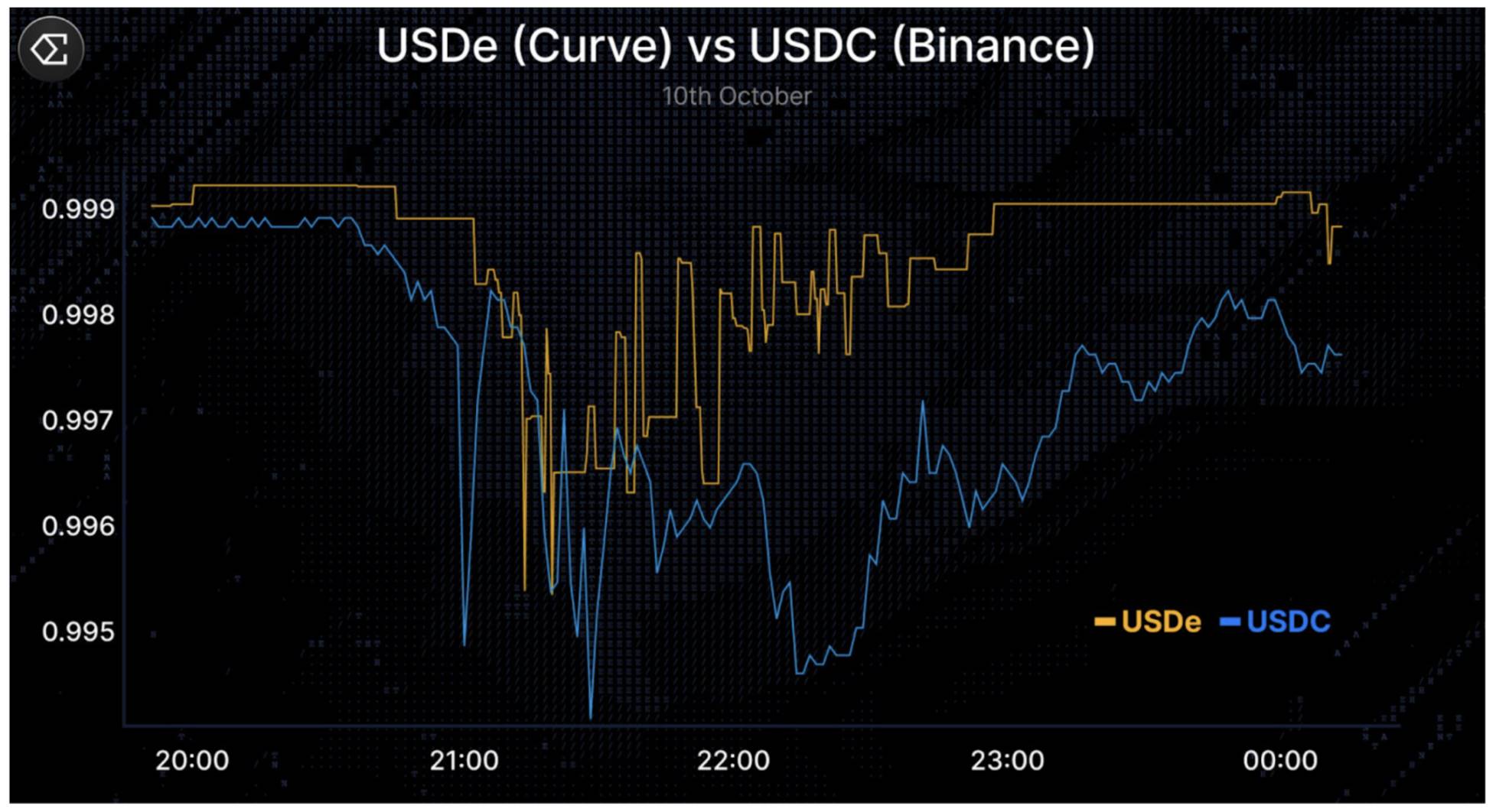 On October 10, 2025, the crypto market experienced an extreme deleveraging event, with approximately $20 billion in positions liquidated within hours as open contracts on major CEXs and DEXs collapsed. During the chain liquidation process, USDe briefly traded as low as about $0.65 on Binance due to the oracle design of Binance, which drew criticism. However, USDe maintained near parity on more liquid chain venues (such as Curve), and the redemption function continued to operate normally, indicating that this was a venue-specific dislocation rather than a systemic decoupling. Guy's tweet on X is an excellent read for understanding the events of October 10.