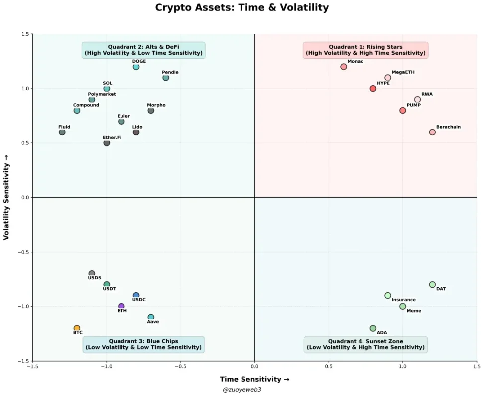• 第一象限(新秀区):HYPE、PUMP、公链 /L2/Alt L1(Monad、Berachain、MegaETH)、RWA(Bond、Gold、Real Estate)