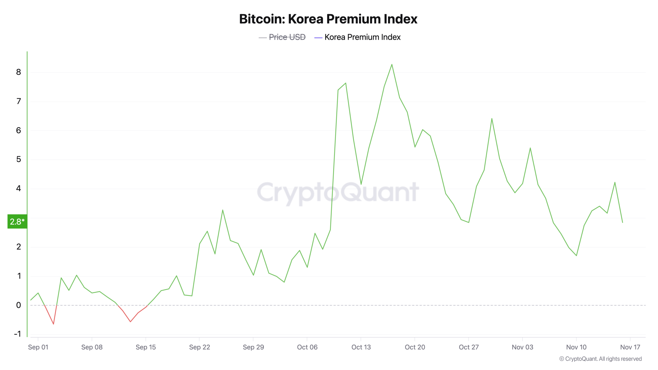 Cryptoquant的数据表明,韩国的比特币溢价已经连续62天保持稳定。