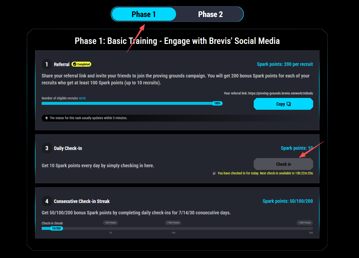 进入交互网站(链接:https://proving-grounds.brevis.network/),在“Phase 1”栏目下完成每日签到,每次签到可获得 10 点积分,连续签到 7/14/30 天可获得额外 50/100/200 点积分。