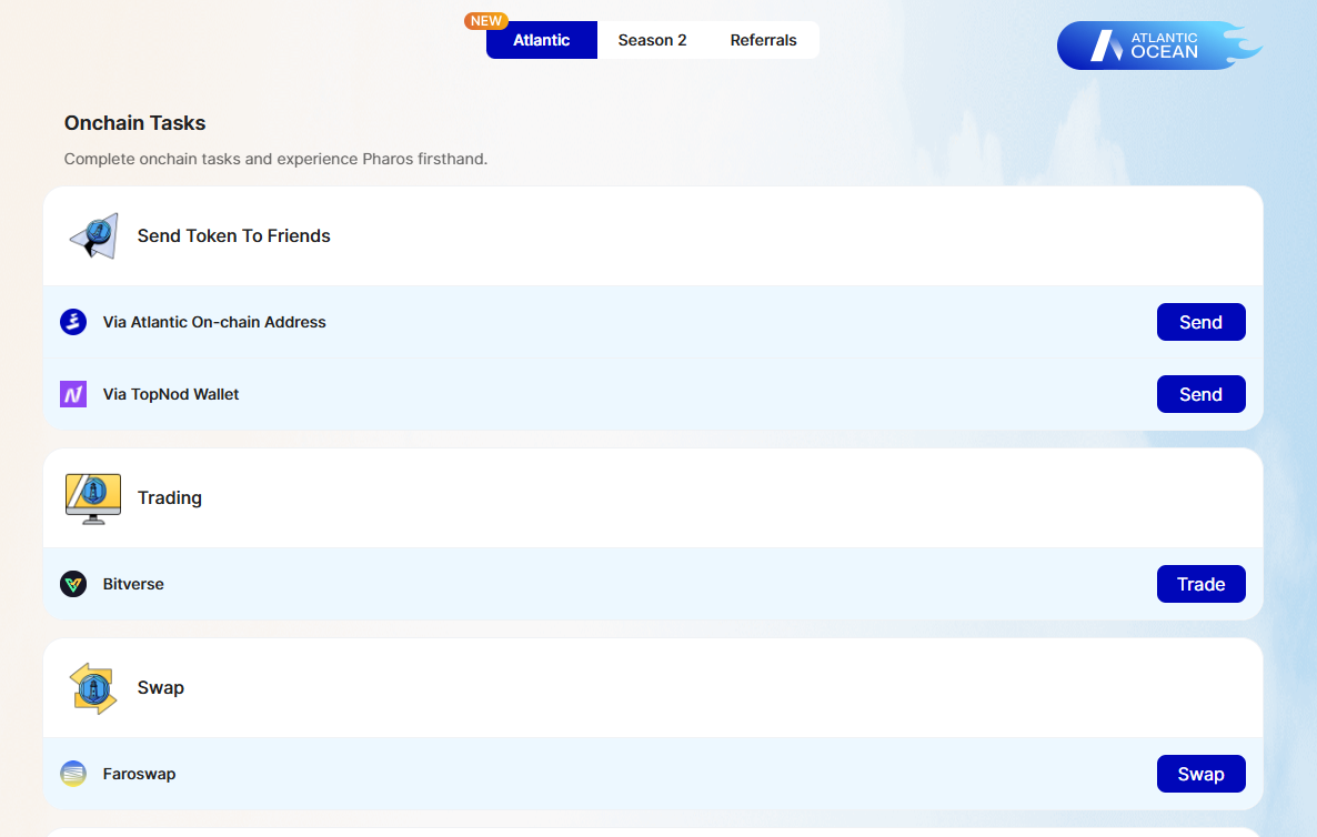此外,当前除了“Season 2”活动外,上新“Atlantic”活动,根据要求完成测试网交互即可(领取测试币链接:https://testnet.pharosnetwork.xyz/)。