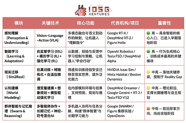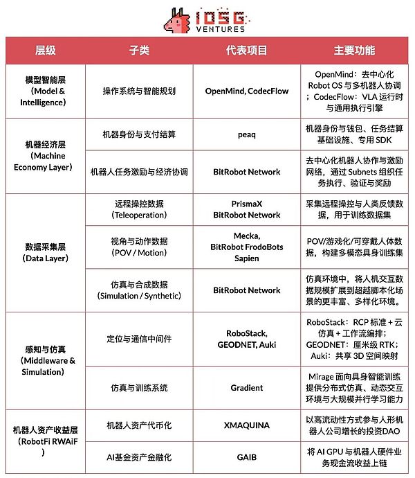 基于「可验证进展、技术公开度、产业相关度」三项标准,梳理当前Web3 × Robotics代表性项目,并按五层架构归类:模型智能层、机器经济层、数据采集层、感知与仿真基础层、机器人资产收益层。为保持客观,我们已剔除明显「蹭热点」或资料不足项目;如有疏漏,欢迎指正。