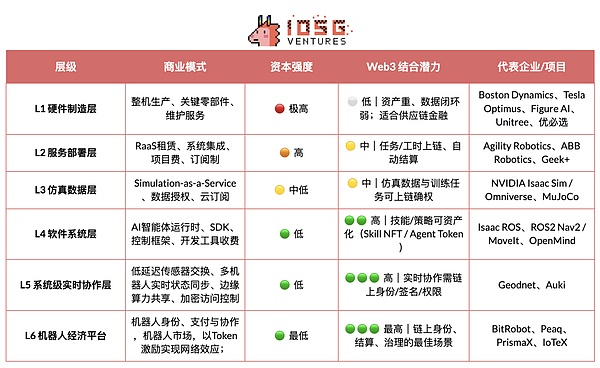 总体来看,短期主要集中在数据采集与激励层;中期有望在「稳定币支付 + 长尾数据聚合」及RaaS 资产化与结算层实现突破;长期,若人形机器人规模化普及,Web3 或将成为机器所有权、收益分配与治理的制度底层,推动真正的去中心化机器经济形成。