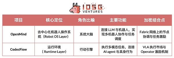 商业模式方面,OpenMind 构建了OM1(开源系统)+ Fabric(结算协议)+ Skill Marketplace(激励层)的三层生态,目前尚无营收,依赖约2000 万美元早期融资(Pantera、Coinbase Ventures、DCG)。总体来看,技术领先但商业化与生态仍处起步阶段,若 Fabric 成功落地,有望成为「具身智能时代的 Android」,但周期长、风险高、对硬件依赖强。