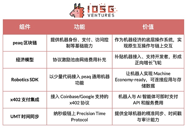peaq 是专为机器经济打造的 Layer-1 区块链,为数百万台机器人与设备提供机器身份、链上钱包、访问控制以及纳秒级时间同步(Universal Machine Time)等底层能力。其 Robotics SDK 使开发者能够以极少代码让机器人「机器经济就绪」,实现跨厂商、跨系统的互操作性与交互。