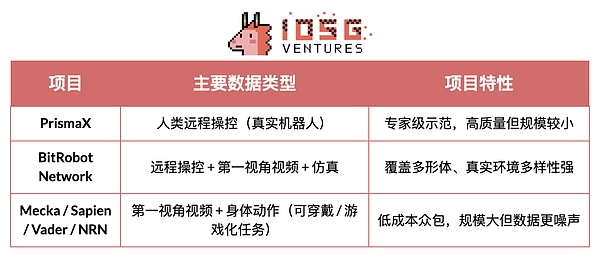 数据采集层(Data Layer) 数据采集层门槛相对最低,但是目前最接近商业可行的方向。具身智能数据采集对时空连续性与动作语义精度要求极高,决定其质量与复用性。如何在「众包规模」与「数据可靠性」之间平衡,是行业核心挑战。PrismaX 先锁定 B 端需求,再分发任务采集验证一定程度上提供可复制模板,但生态规模与数据交易仍需时间积累。