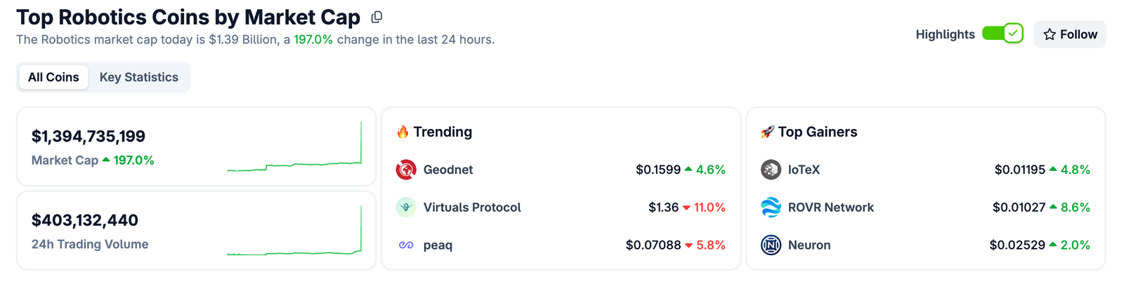 尽管机器人叙事充满想象空间,但其当前在加密市场的整体规模相对较小,有相当大的增长空间。据Coingecko截止2025年11月数据显示:总市值近 14亿美元,但在24H内实现了197%的增长,表明虽然新赛道尚处于萌芽阶段,但已吸引了大量投资者的关注。
