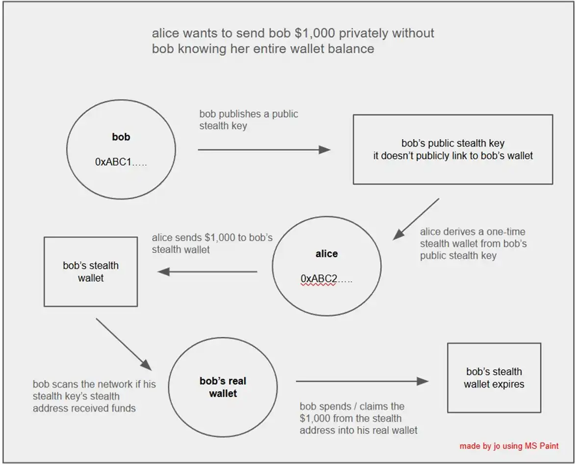 - 假设 Bob 有一个普通地址(0xABC...),他创建一个与该地址关联的隐蔽密钥对