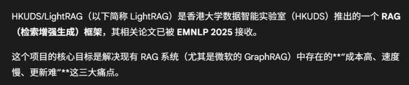 I chose a project that has recently gained a lot of stars on GitHub, called LightRAG. This project enhances contextual awareness and efficient information retrieval by integrating graph structures, thereby improving retrieval-augmented generation, achieving higher accuracy and faster response times. Project link: https://github.com/HKUDS/LightRAG