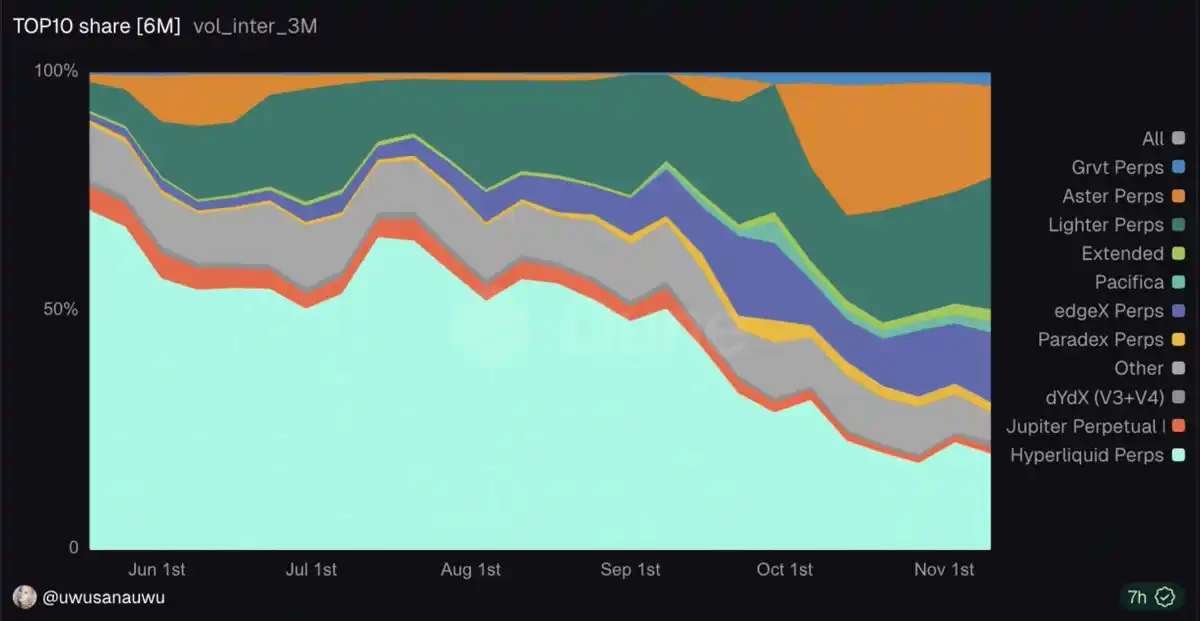 Over the past year, Hyperliquid has almost monopolized the market, peaking in May with a 71% share of on-chain perpetual contract trading volume. However, by November, its market share had plummeted to just 20%, with emerging competitors rapidly claiming territory: