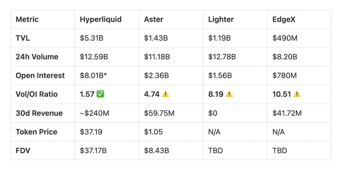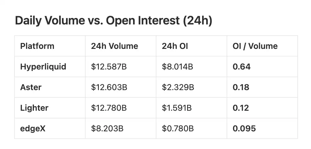Hyperliquid: High OI/trading volume ratio (approximately 0.64), indicating a significant conversion of trading flow into sustained positions.