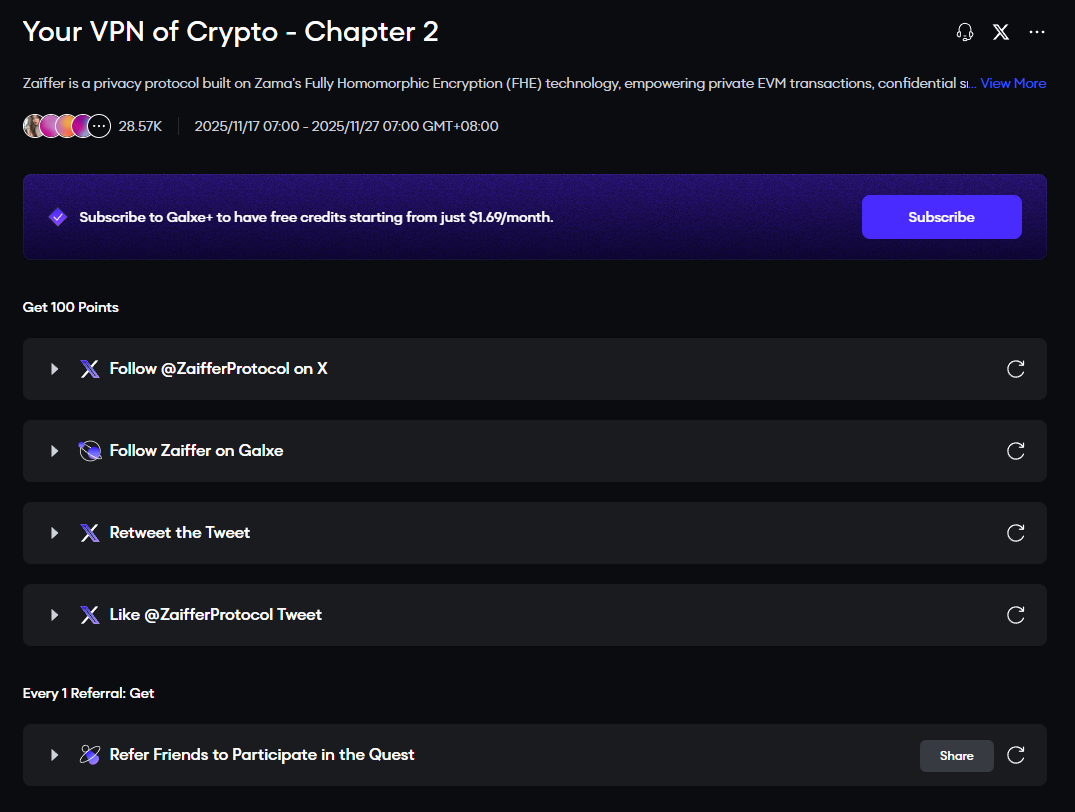 Task Two (link: https://app.galxe.com/quest/Zaiffer/GC8jMt8Kpz) is Your VPN of Crypto - Chapter 2, all are social tasks.