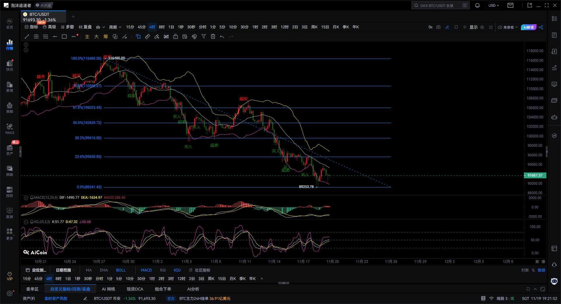 咱们先来看整体情况。比特币从高点116400一路跌下来,最低砸到89241,现在在91600-91,800之间反复晃动。这是个震荡的局面,但各种指标都在暗示——可能要变了。